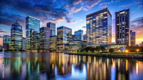 Fototapeta premium Dusky skyline with illuminated office buildings creating a tranquil oasis for...