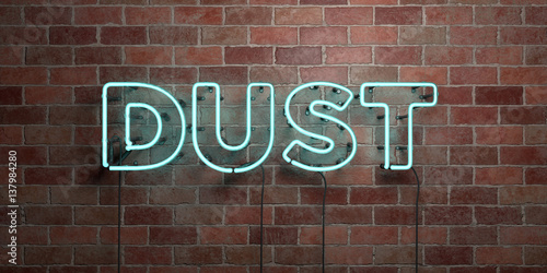 Obraz premium DUST - fluorescent Neon tube Sign on brickwork - Front view - 3D rendered royalty free stock picture. Can be used for online banner ads and direct mailers..