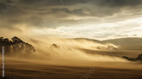 © Ponchita, Obraz premium Dust Storm Rolling Through a Field at Sunset, Creating a Dramatic and Eerie Landscape