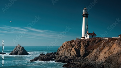 © Phanet, Fototapeta premium Dusty blue lighthouse with clean lines trustworthy and bold for tech-meets-ocean concepts
