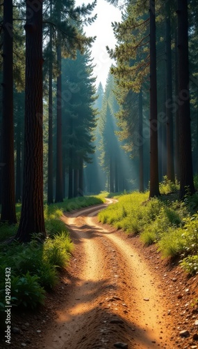 Fototapeta premium Dusty brown track curves through tall pine trees , sunlight, dust, summer heat