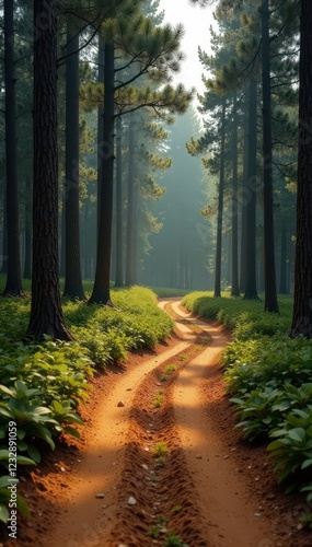 Obraz premium Dusty brown track curves through tall pine trees , trees, track