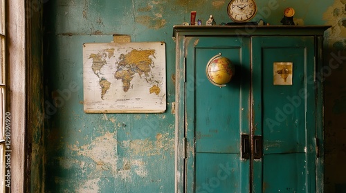 Naklejka premium Dusty classroom, world map, vintage cabinet