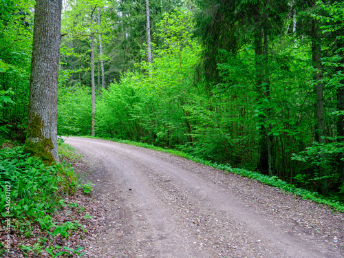 © Martins Vanags, Naklejka premium dusty gravel road in summer green fresh wet forest