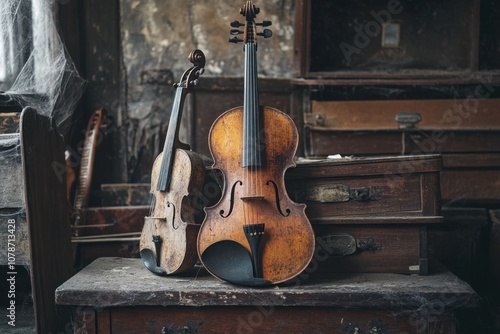 © Thanapong, Naklejka premium Dusty, old musical instruments abandoned in a corner of a dimly lit room, with cobwebs and broken strings. Ample copy space to evoke the silence of forgotten melodies and times.