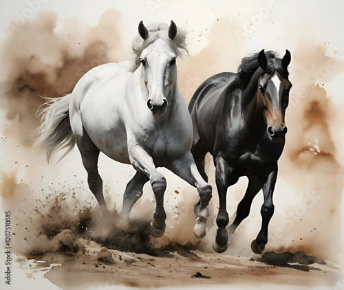 © Hani, Obraz premium Dusty Trail Black and White Horses Painted in Motion with blur background ai
