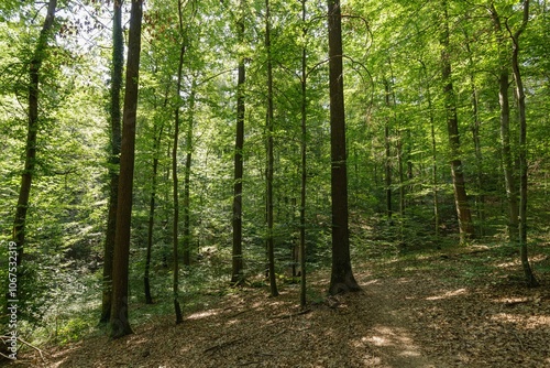 Obraz premium Dusty trail path in a green forest with trees under bright sky