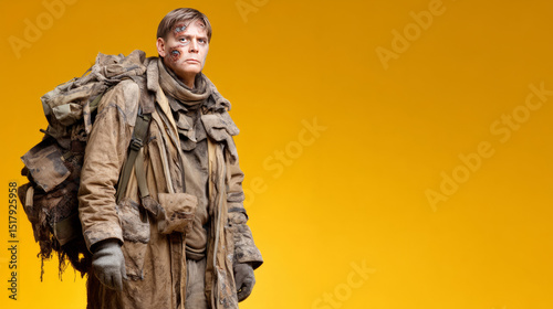 Fototapeta premium Dusty voyager with steely gaze, journeying through post-apocalyptic realm; perfect for Survival Day, Offbeat Explorer Festival themes