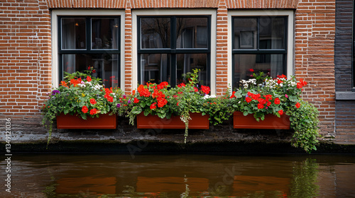 Fototapeta premium Dutch canal house brick facade tall narrow windows vibrant flower boxes...
