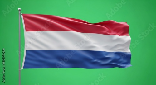 © Margarita Ratatosk, Naklejka premium Dutch flag waving on a pole on a green screen. Chroma key ready background for patriotic content. National day and independence day concept.