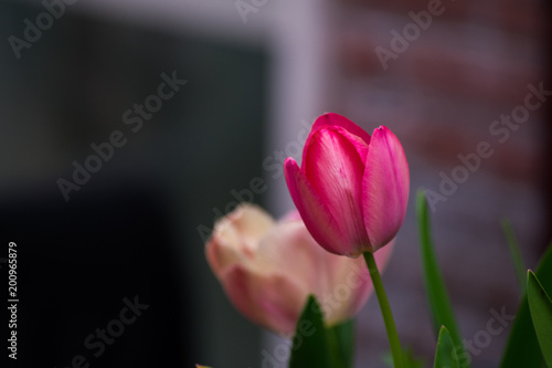 © Jacco, Fototapeta premium Dutch Pink Purple Yellow Tulips In Water With Green Leaves