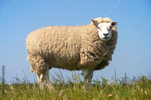 © Rob Bouwman, Obraz premium Dutch polder landscape with grazing and lying sheep on a green grass dyke