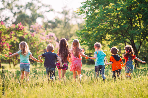 Obraz premium Duża grupa dzieci, przyjaciół chłopców i dziewcząt biegających w parku w...