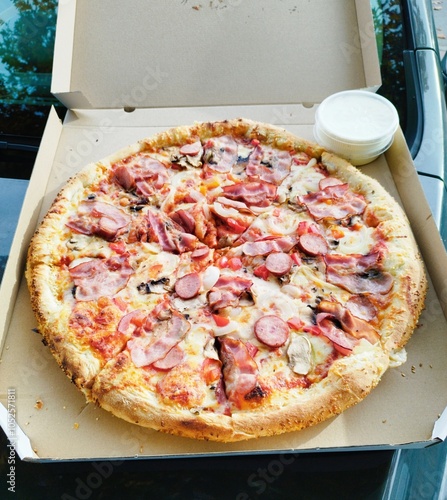 Naklejka premium Duża pizza w kartonie na wynos, kolorowa, smaczna, wypieczona.