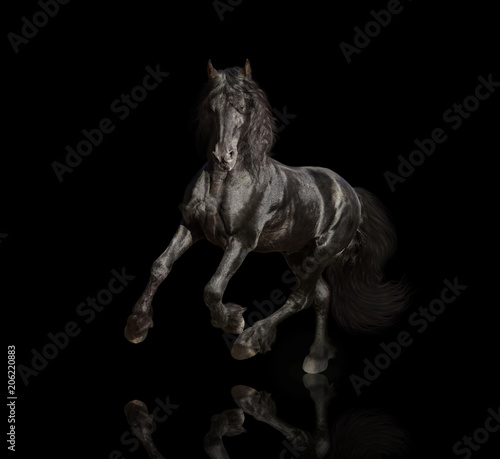© ashva, Fototapeta premium Duży czarny koń fryzyjski działa na białym tle na czarnym tle