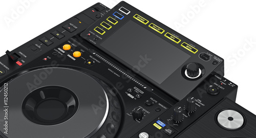 Fototapeta premium Duży wyświetlacz miksera dj, ze świecącymi przyciskami, zbliżenie. Grafika 3D