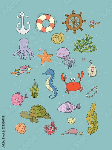 Obraz premium Duży zestaw marine. Motyw morski. Kreskówka rozgwiazda żółwia, zabawna ryba, meduza i konik morski, wodorosty i butelka z notatką.