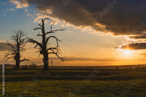 © fotozen, Obraz premium Dwa dęby rogalińskie podczas zachodu słońca