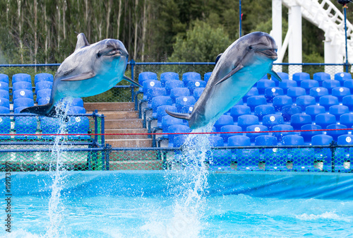© schankz, Obraz premium dwa delfiny skaczące w basenie