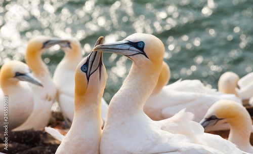 Obraz premium Dwa głuptaki północne (Morus bassanus lub Sula bassana), pozdrawiają się,...