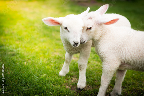 Obraz premium Dwa jagnięta przytulające się na zielonym polu