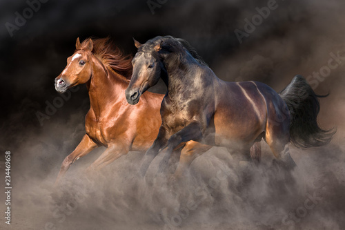 © kwadrat70, Fototapeta premium Dwa koń biegać galopem z ciemnym tłem za