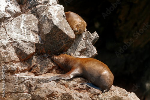 © simonmayer, Fototapeta premium Dwa lwy morskie śpią opalając się na skale na wyspach Ballestas (Paracas, Peru)