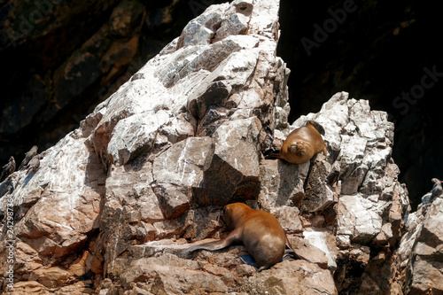 © simonmayer, Fototapeta premium Dwa lwy morskie śpią opalając się na skale na wyspach Ballestas (Paracas, Peru)