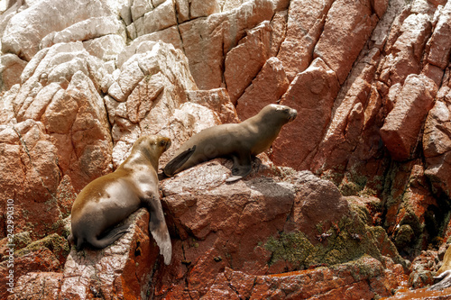 © simonmayer, Fototapeta premium Dwa lwy morskie wędrują wśród czerwonych skał wysp Ballestas (Paracas, Peru)