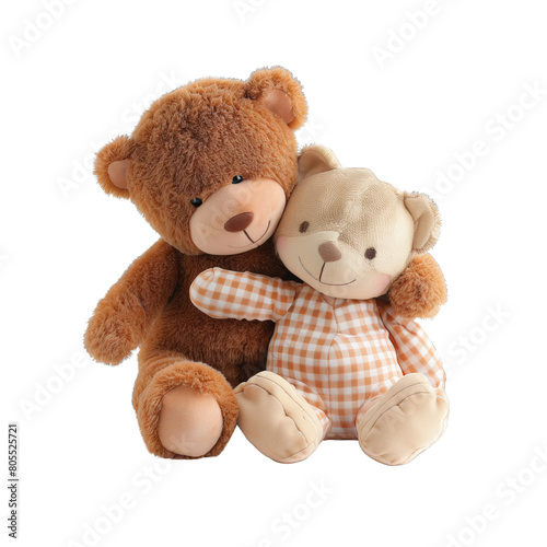 Fototapeta premium Dwa misie pluszowe siedzące obok siebie na przezroczystym tle PNG. Jedno z...
