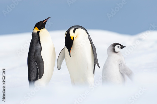 © Silver, Fototapeta premium Dwa pingwiny cesarskie z pisklęciem na Snow Hill