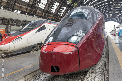 Obraz premium Dwa pociągi dużych prędkości na stacji kolejowej w Mediolanie - Włochy
