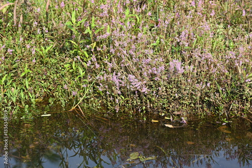 Fototapeta premium Dwarf rotala or Rotala rotundifolia flowers. It is an aquatic plant that has...