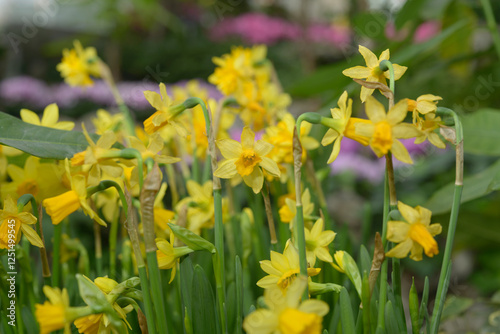 Fototapeta premium dwarf yellow daffodils slightly passed their prime