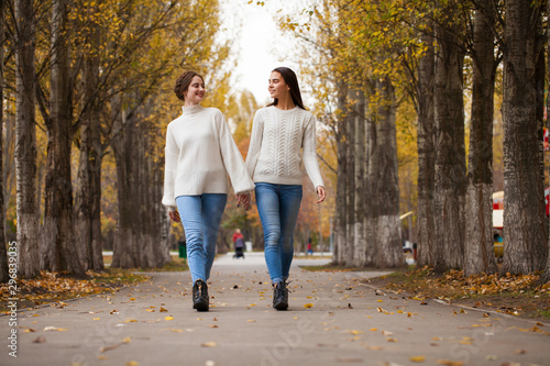 © Andrey_Arkusha, Fototapeta premium Dwie dziewczyny w białym wełnianym swetrze i dżinsach