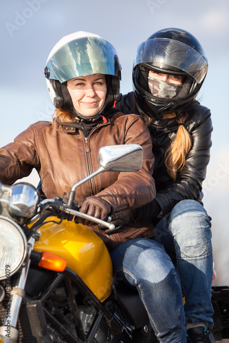 © Kekyalyaynen, Fototapeta premium Dwie Europejki jadące razem na jednym rowerze, pasażer siedzący za kierowcą