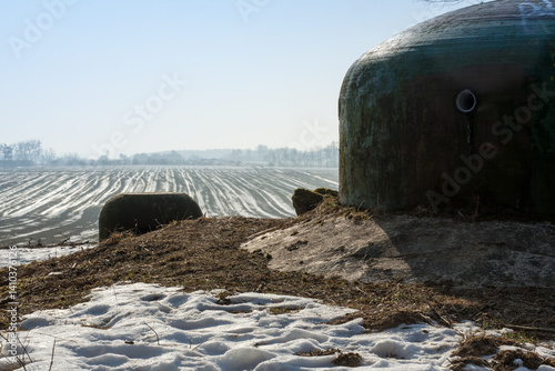 © qrrr, Obraz premium Dwie stalowe kopuły poniemieckich bunkrów wśród zaśnieżonych pól