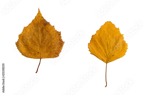 Fototapeta premium dwie suche żółte liście brzozy na białym tle