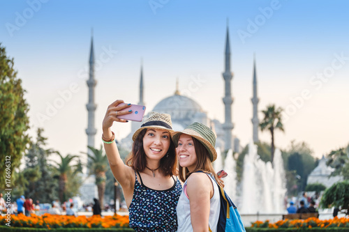 Obraz premium Dwie uśmiechnięte dziewczyny robią selfie przed Błękitnym Meczetem w...