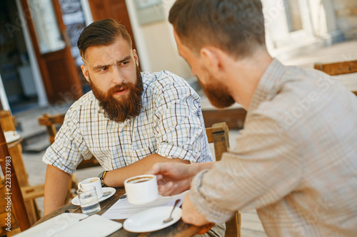 © shyshka, Obraz premium dwóch mężczyzn pije kawę w kawiarni
