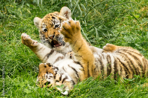 © noisefotografie, Fototapeta premium dwoje małych dzieci Amur Tygrys bawią się razem