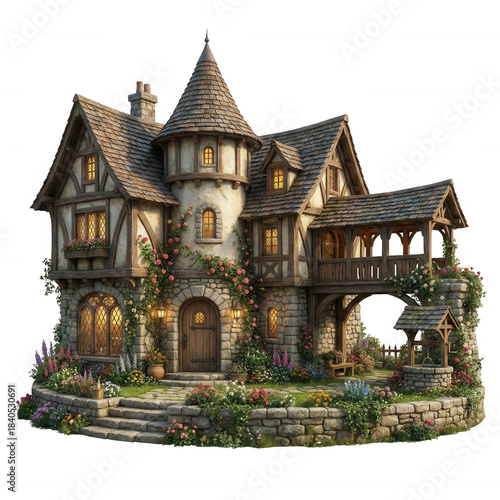© Sandu, Fototapeta premium dyllic Fantasy Medieval Stone Cottage with Round Tower and Flower Garden