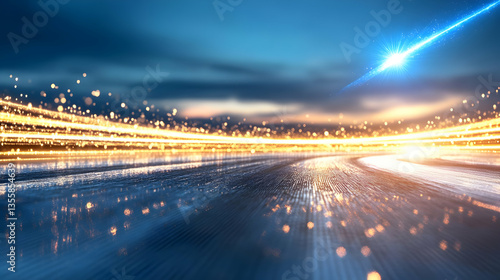 © Dibani, Fototapeta premium Dynamic Abstract Background with Flowing Blue and Orange Light Trails on Dark Backdrop Futuristic Design with Glowing Effects Digital Art and Motion Blur for Technological Concepts
