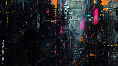 Naklejka premium Dynamic abstract cityscape painting with vibrant neon