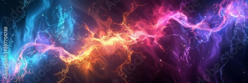 Fototapeta premium Dynamic abstract display of vibrant, multicolored energy waves resembling lightning or cosmic phenomena.