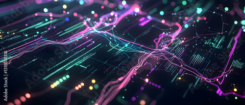 Fototapeta premium Dynamic Abstract Visualization With Vibrant Neon Light Particles On A Dark...