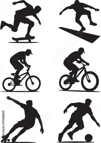 Fototapeta premium Dynamic athlete silhouettes performing extreme sports and soccer