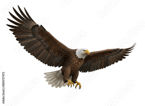 Obraz premium Dynamic Bald Eagle Soaring Against Clean White Background