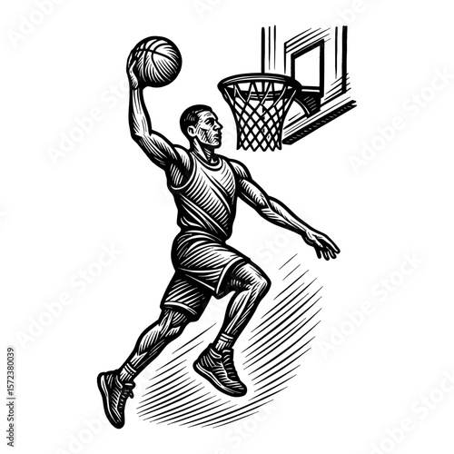 © Zidan, Fototapeta premium Dynamic Basketball Player Dunking Action Black and White Outline Line Art Drawing with Hoop