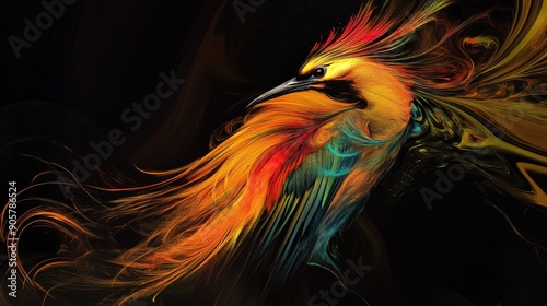 © samrit, Obraz premium Dynamic beauty of a long-feathered bird with swirling colors on dramatic black backdrop